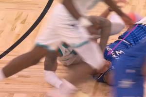 GIF-小橋跟貝恩倒地了,小橋有鎖喉和按人的動作,被吹技術犯規(guī)!