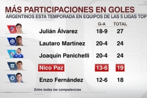本賽季五大聯(lián)賽阿根廷球員參與進(jìn)球榜: