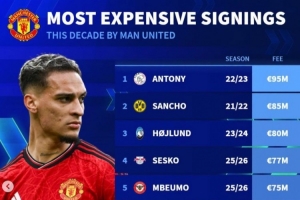 體育資訊4月19日訊 《轉(zhuǎn)會市場》統(tǒng)計了曼聯(lián)自2020年以來的最貴引援情況,B費(fèi)僅位列第9位。