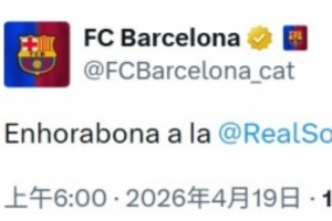 體育資訊4月19日訊 國(guó)王杯決賽已經(jīng)完賽,馬競(jìng)在點(diǎn)球大戰(zhàn)中3-4不敵皇家社會(huì)。巴薩官推在賽后第一時(shí)間發(fā)推:“祝賀@皇家社會(huì)贏得國(guó)王杯冠軍。”