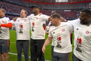 今天凌晨,拜仁4-2擊敗斯圖加特,將隊史第35座聯(lián)賽冠軍完美收入囊中。賽后,安聯(lián)球場內(nèi)洋溢著狂歡的氣氛,而主角是一件極其特別的紀(jì)念衫。
