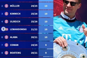 體育資訊4月20日訊 德甲第30輪比賽,拜仁以4-2的比分戰(zhàn)勝斯圖加特鎖定本賽季的德甲冠軍,諾伊爾、基米希、烏爾賴希等人再添一個德甲冠軍獎牌。德國轉(zhuǎn)會市場盤點(diǎn)了球員德甲獲得德甲冠軍的數(shù)量,諾伊爾和穆勒均拿到13個德甲冠軍并列榜首,前10均為拜仁球員。