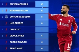 數(shù)據(jù)統(tǒng)計顯示,薩拉赫在默西賽德郡德比歷史射手榜位列次席。