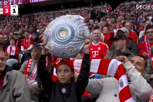 體育資訊04月20日訊 德甲第30輪,拜仁慕尼黑vs斯圖加特。上半場拜仁已取得3-1的領(lǐng)先,距離德甲提前奪冠近在咫尺??磁_上心情愉悅的小球迷高舉沙拉盤抱枕。