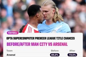 仍領(lǐng)先!Opta超算英超奪冠概率:阿森納輸球仍有73%,曼城升至27%