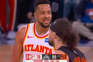 比賽第三節(jié),老鷹球員CJ·麥科勒姆與尼克斯球員阿爾瓦拉多發(fā)生口角,雙方吃到技犯。尼克斯主場(chǎng)球迷開始高呼:“F**k CJ?!?/p>