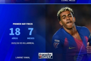 體育資訊3月3日訊 德國轉(zhuǎn)會市場盤點了部分球星首次戴帽的年齡,姆巴佩17歲,亞馬爾18歲,梅西19歲。