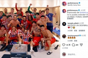 馬競(jìng)前鋒朱利亞諾·西蒙尼社媒曬出與隊(duì)友們?cè)诟率覂?nèi)的大合照,配文:“愛上馬競(jìng),這種情感你無法理解!我們晉級(jí)決賽了!加油,永遠(yuǎn)!”