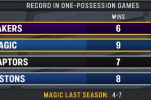 湖人主場迎戰(zhàn)魔術,轉播方給出一項統(tǒng)計,本賽季一回合定勝負(分差3分以內)的比賽,湖人6勝0負排名第一,魔術9勝3負排名第二。